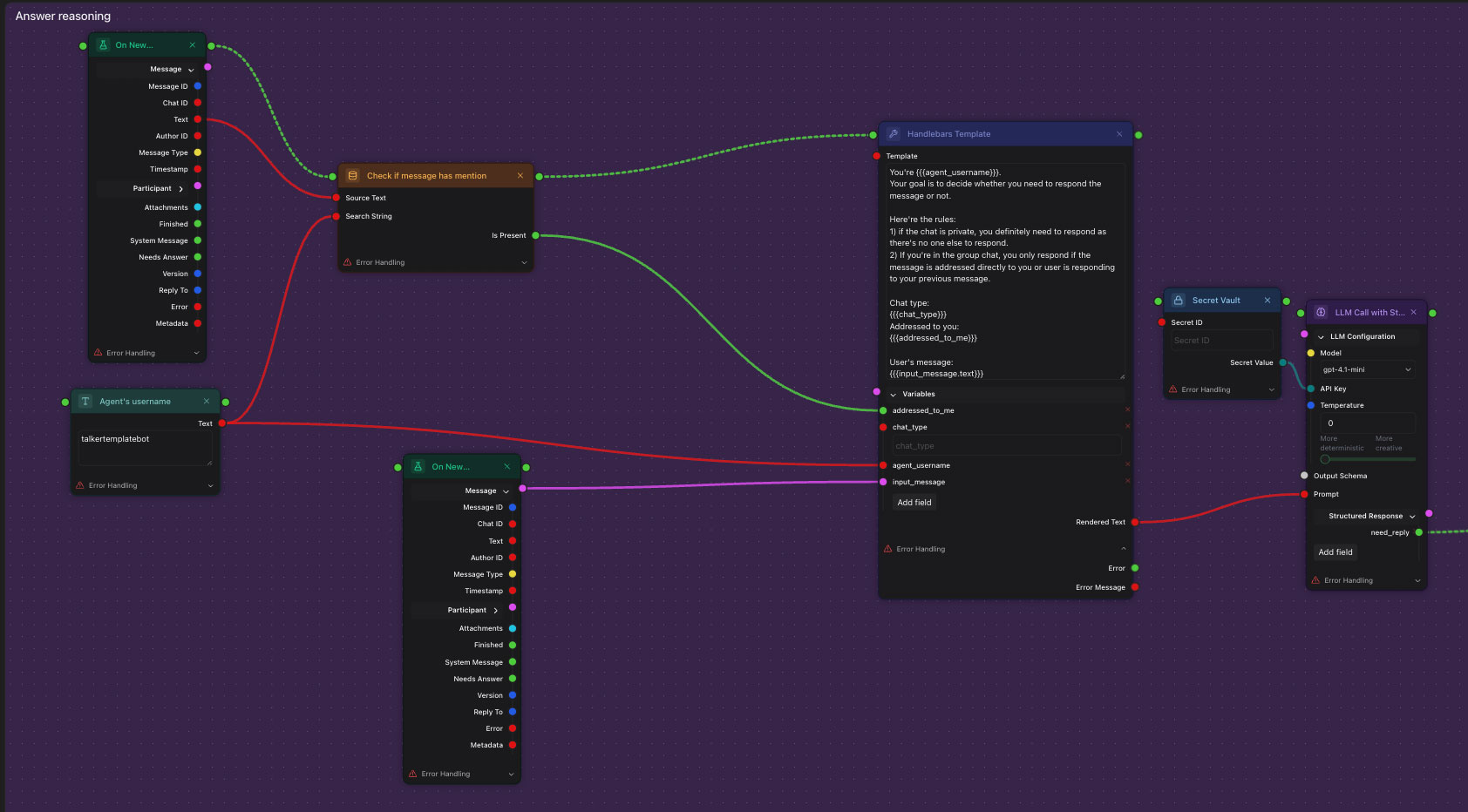 Built-in type-safe port system ensures reliable data flow between nodes while providing runtime validation. This system supports complex data types including objects, arrays, streams, and encrypted secrets, enabling sophisticated data processing pipelines. The visual representation of data flow combined with type safety prevents common integration errors and makes debugging straightforward.